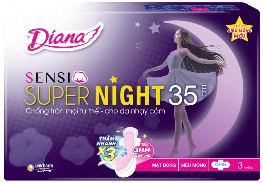 Đặc điểm nổi bật:Diana Super Night được trang bị lõi thấm kép Duo Compact có bổ sung các hạt cao phân tử giúp miếng băng mỏng hơn cho khả năng thấm hút tốt hơn gấp 2 lần.