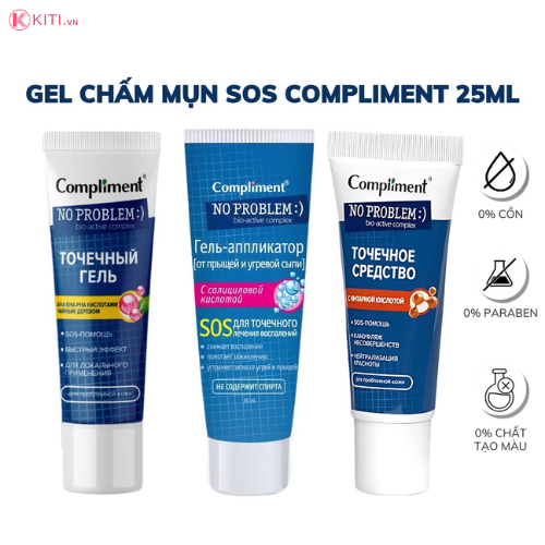 Gel Chấm Mụn Compliment No Problem là các sản phẩm điều trị mụn tại chỗ (spot treatment) đến từ thương hiệu Compliment của Nga. Các sản phẩm này thuộc dòng Bio-Active Complex, sử dụng các hoạt chất mạnh mẽ như Salicylic Acid, Succinic Acid và phức hợp AHA/PHA để giải quyết tận gốc các vấn đề về mụn. Tùy vào tình trạng mụn (mụn viêm, mụn ẩn, mụn sưng đỏ cấp tính), người dùng có thể lựa chọn phân loại phù hợp để tối ưu hóa hiệu quả điều trị.