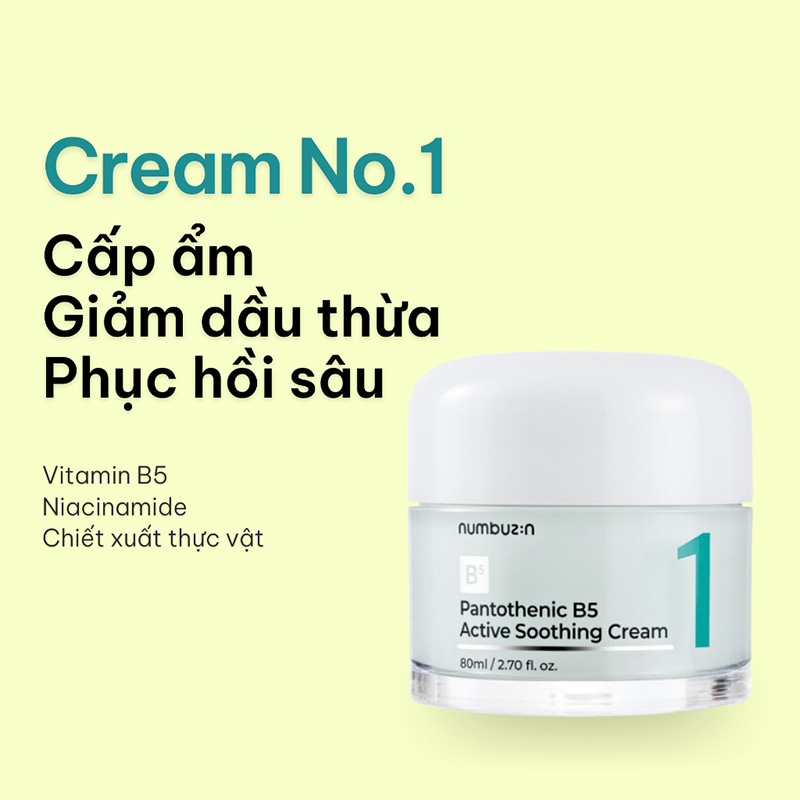 - Kem Dưỡng Numbuzin No.1 Pantothenic B5 Active Soothing Cream Làm Dịu Da giúp dưỡng ẩm, làm dịu, phục hồi tổn thương do mụn, giảm tiết dầu thừa, kháng viêm, giảm mụn và mờ thâm.