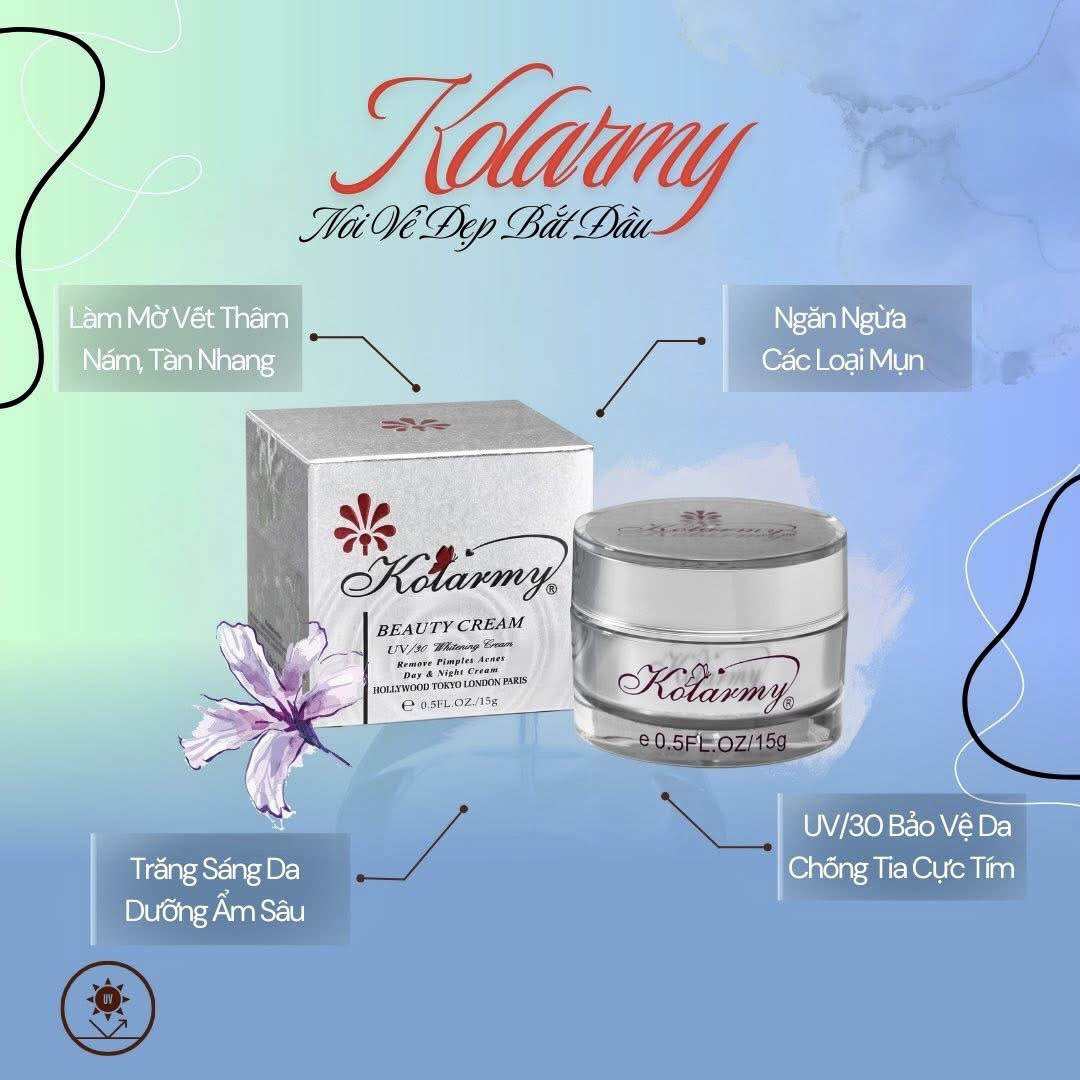 - Kem Dưỡng Trắng Da Cao Cấp Kolarmy với thành phần từ các loại thảo dược, Vitamin, dưỡng chất cần thiết cho da đã tạo ra Kem dưỡng da với công dụng chăm sóc da cao: