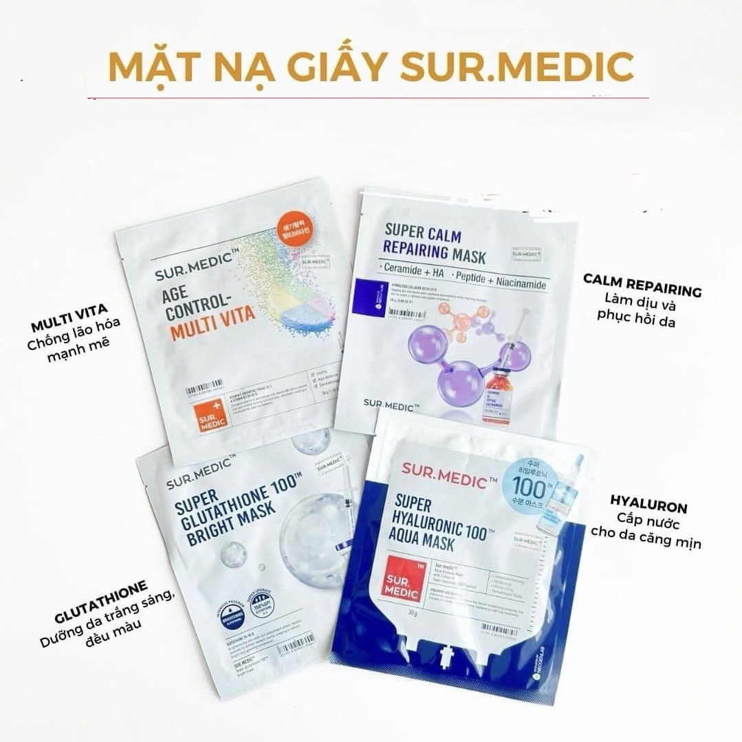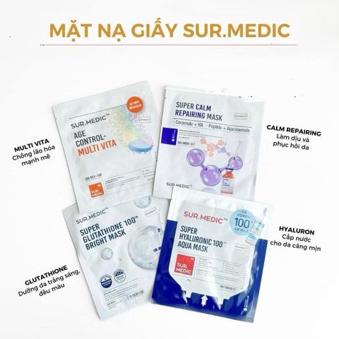 Mặt nạ Sur Medic chính hãng (có nhãn phụ tiếng Việt) tại EU Store có 4 loại với 4 công dụng khác nhau: Mask Sur Medic Glutathione dưỡng trắng da, mờ thâm sạm – Mask Sur Medic Super Hyaluronic 100™ Aqua cấp nước và dưỡng ẩm da – Mask Sur Medic Super Calm Repairing Mask phục hồi và làm dịu da cấp tốc – Mask Sur Medic Age Control Multi Vita sáng da, bổ sung vitamin và độ ẩm cho da.