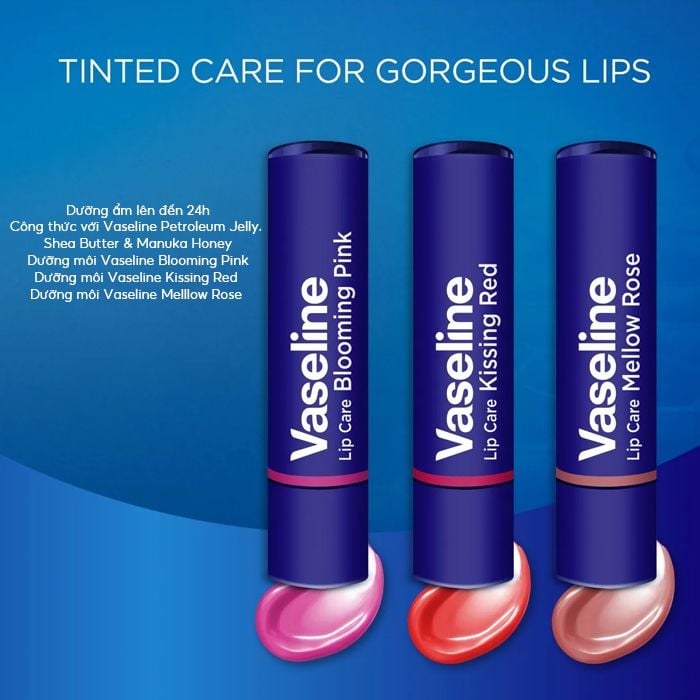 - Son dưỡng có màu Vaseline Colour+Care có thể sử dụng hằng ngày dù là đi học, đi làm hay đi chơi và dễ dàng thoa lại để đôi môi luôn căng mọng rạng rỡ.