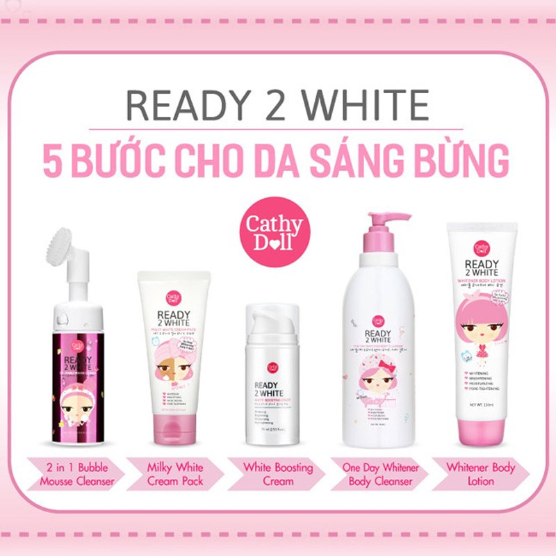 Sữa Dưỡng Thể Trắng Da Tức Thì Cathy Doll Ready 2 White Whitener Body Lotion là sữa dưỡng thể thuộc thương hiệu Cathy Doll với các thành phần dưỡng trắng chứa Glutathione chiết xuất thiên nhiên, Arbutin cùng nhớt ốc sên giúp nuôi dưỡng đến tận cấp độ tế bào, cho hiệu quả dưỡng trắng tối ưu, nuôi dưỡng và phục hồi da xỉn màu, thiếu sức sống, làm mờ các khuyết điểm trên da. Đồng thời với công thức được cải tiến, nâng cao khả năng thẩm thấu sâu vào da cùng mùi hương hoa ngọt ngào cho bạn làn da mềm mịn, trắng sáng và trẻ trung.