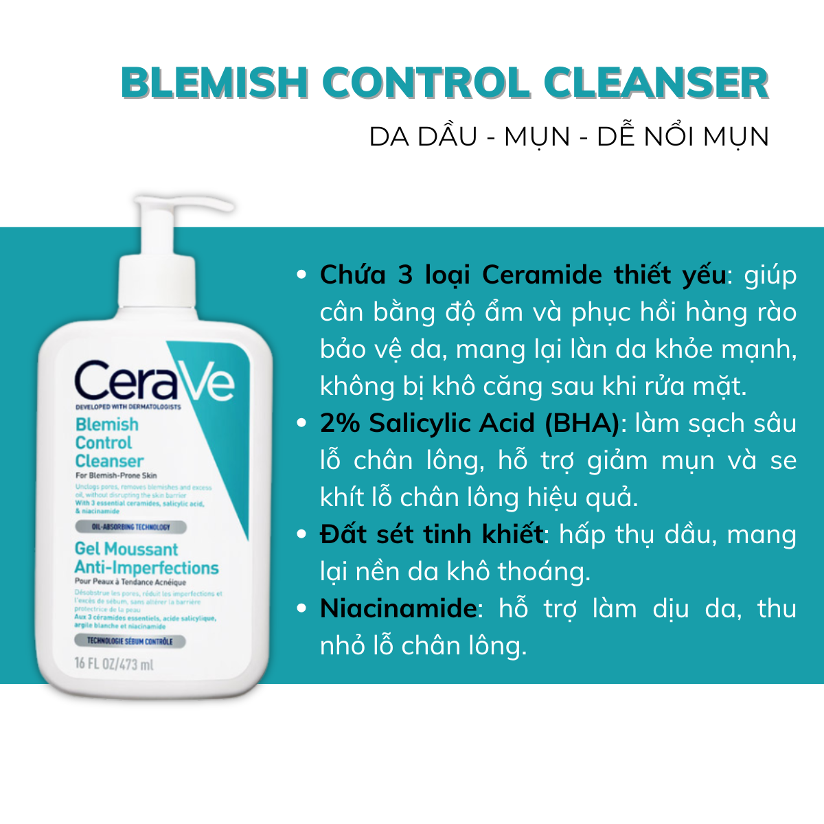 Sữa Rửa Mặt Giảm Mụn Blemish Control Cleanser đến từ thương hiệu Cerave được phát triển cùng các chuyên gia da liễu, sữa rửa mặt dạng gel tạo bọt với 2% Salicylic Acid và đất sét tinh khiết giúp làm sạch sâu, thông thoáng lỗ chân lông và hỗ trợ giảm mụn hiệu quả. Công thức dịu nhẹ chứa thêm Niacinamide giúp làm dịu da, cùng 3 loại Ceramide thiết yếu giúp phục hồi và duy trì hàng rào bảo vệ da. Sản phẩm phù hợp cho làn da dầu mụn, hỗ trợ cải thiện làn da khỏe mạnh mà không gây khô căng hay kích ứng.