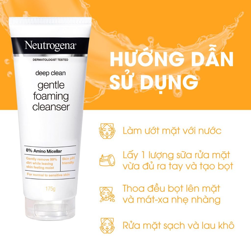Sữa rửa mặt Neutrogena Deep Clean Gentle Foaming Cleanser đã được các bác sĩ da liễu thử nghiệm và khuyên dùng. Sản phẩm có kết cấu dạng kem đặc, nhanh chóng tạo bọt bông mịn, len lỏi sâu vào lỗ chân lông để làm sạch tối ưu.