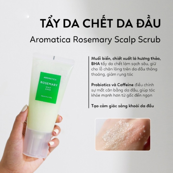Tẩy tế bào chết cho da đầu Aromatica Rosemary Scalp Scrub 165g là một liệu trình chăm sóc chuyên sâu, sử dụng muối biển giàu khoáng chất để làm sạch sâu da đầu, loại bỏ tế bào chết, dầu thừa và gàu, giúp da đầu khỏe mạnh và tóc bồng bềnh hơn.