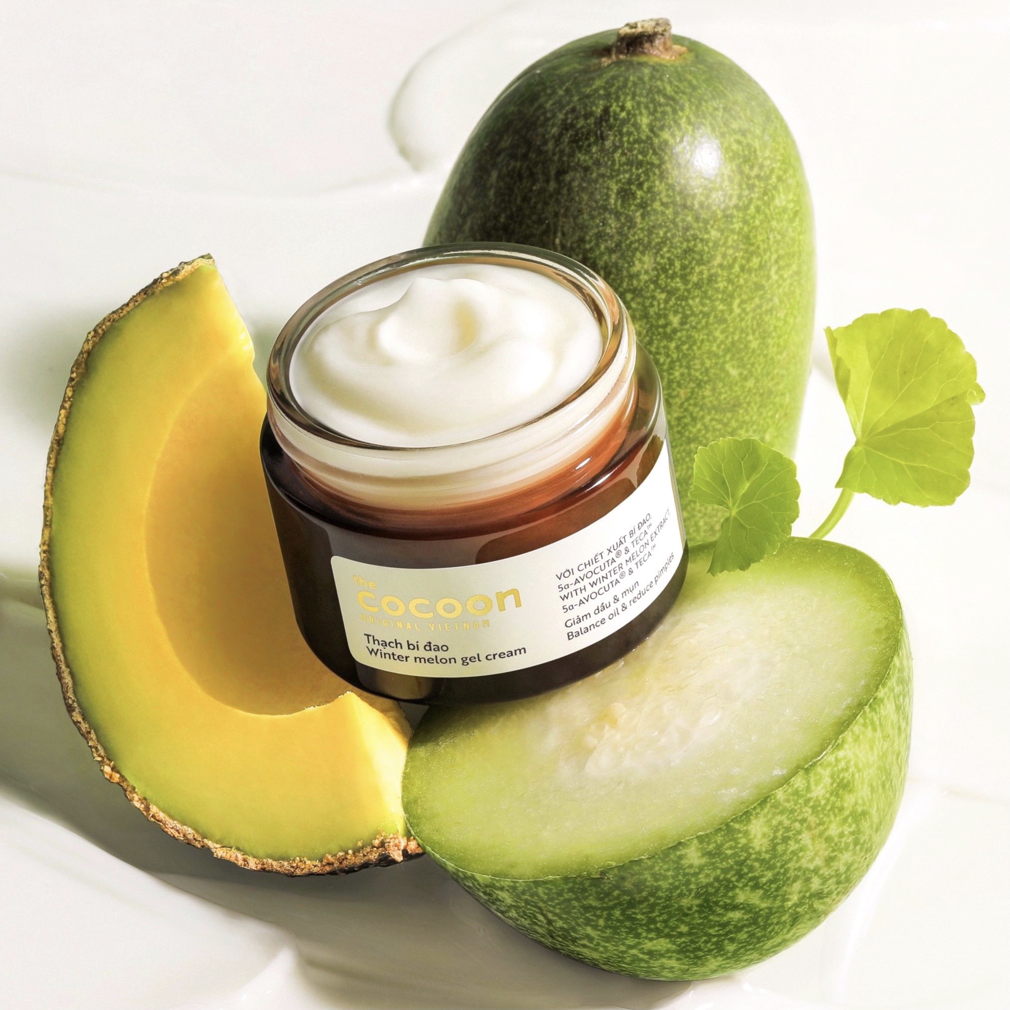 Thạch Bí Đao Dưỡng Ẩm Cocoon Giảm Dầu và Mụn Winter Melon Gel Cream 30ml chứa 5α-AVOCUTA® được chưng cất phân tử từ dầu quả bơ và TECA™ trích ly từ rau má, thạch dưỡng bí đao với kết cấu mỏng nhẹ tan nhanh vào da giúp mang lại độ ẩm cân bằng, giảm lượng dầu thừa và cải thiện tình trạng mụn. Dạng thạch mềm có màu trắng đục và hương tinh dầu tràm trà thoang thoảng, dễ chịu.